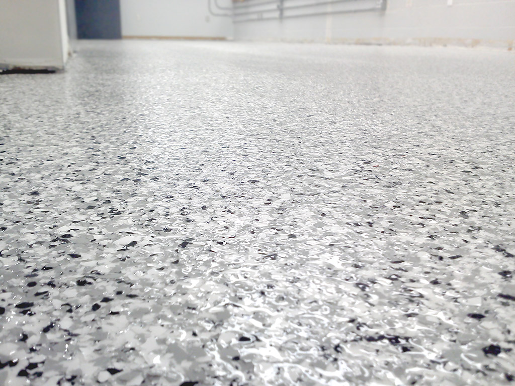 Epoxy floor coating is a resin-based solution formed by combining epoxy resin with a hardener. The result is a rigid, durable surface that bonds mechanically and chemically with concrete. Epoxy floor coatings come in a range of pigment options, which can be combined with colored flakes, metallic finishes, or ceramic quartz to tie in with your facility’s theme. Vinyl graphics and logos can also be sealed into the coating for unique branding.